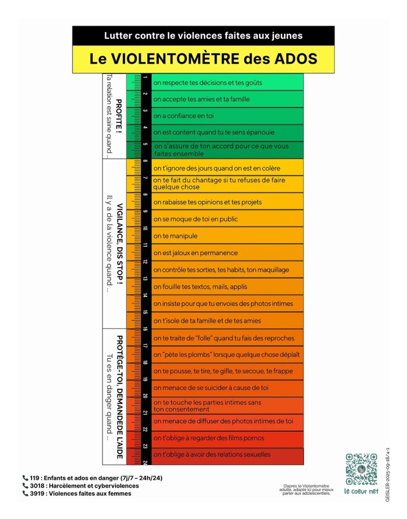 Plusieurs ouvrages passionnants : les livres de la psychiatre Muriel Salmona, spécialiste en la matière. Vous retrouverez également quelques ouvrages spécifique aux violences sexuelles faites aux enfants et un outil que j’affectionne et que j’ulise au cabinet : le violentomètre (dédié aux violences en tout genre, je vous en laisse un aperçu concernant les adolescent.es).